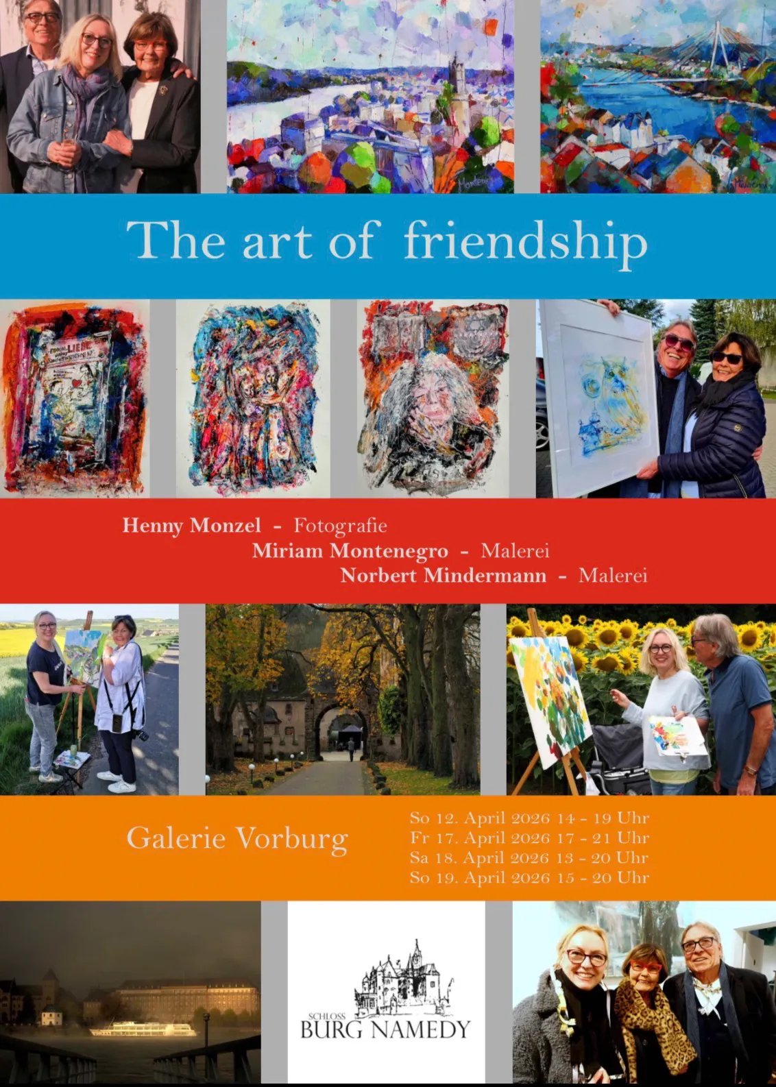 Unter dem Titel „The art of friendship“ präsentieren die Künstler Miriam Montenegro (Malerei), Henny Monzel (Fotografie) und Norbert Mindermann (Malerei) ihre Arbeiten in der Galerie Vorburg von Schloss Namedy.